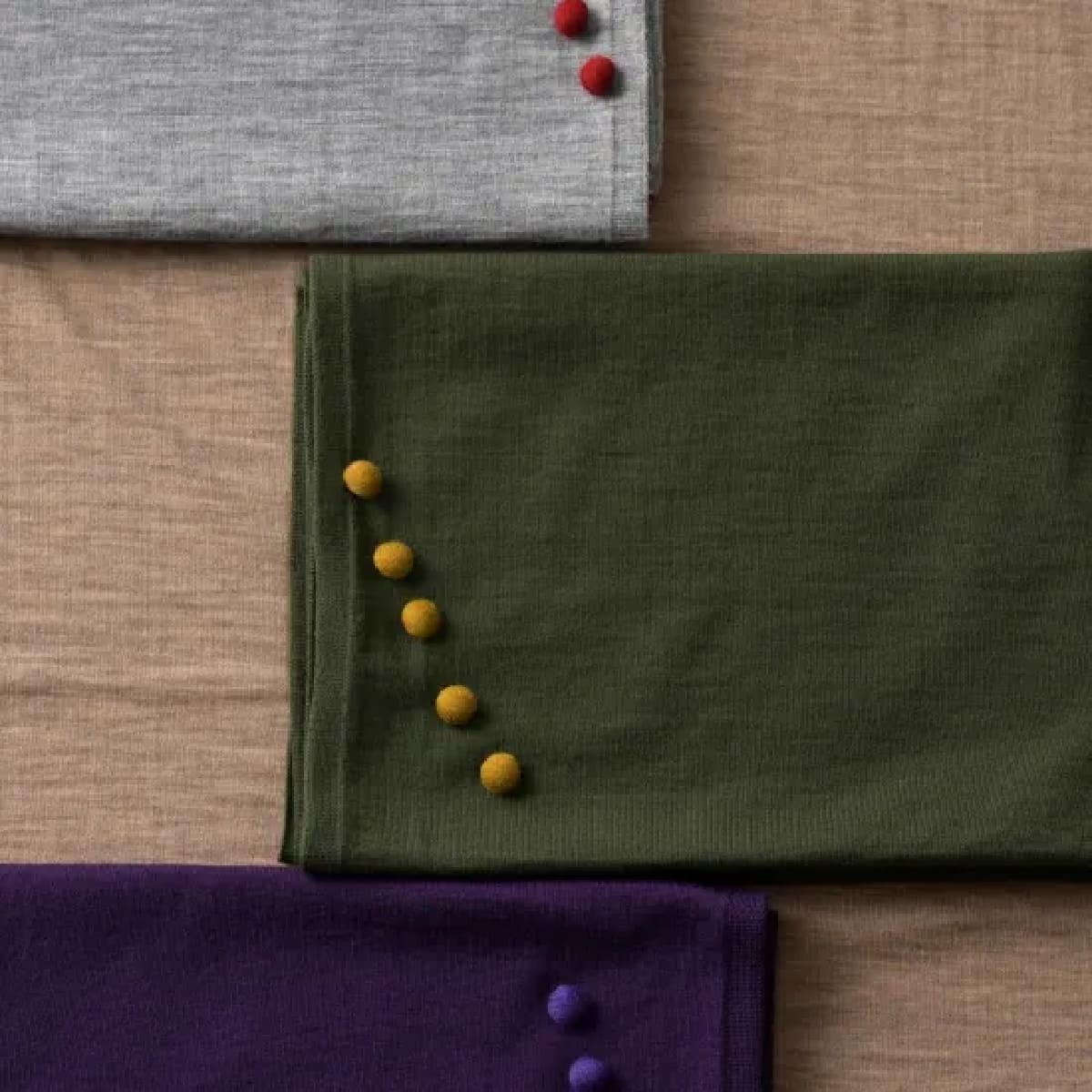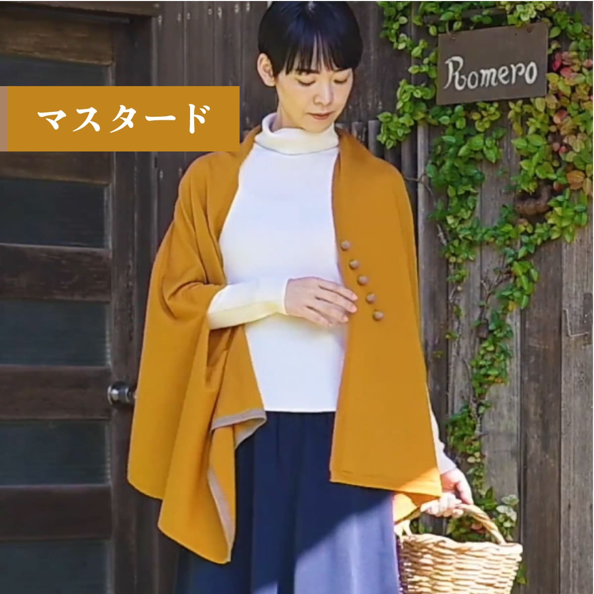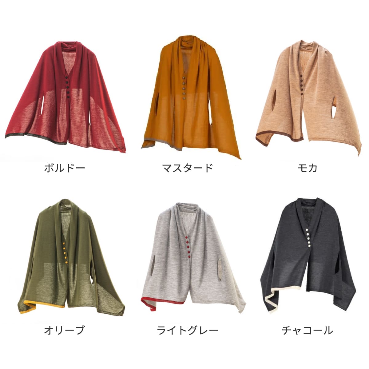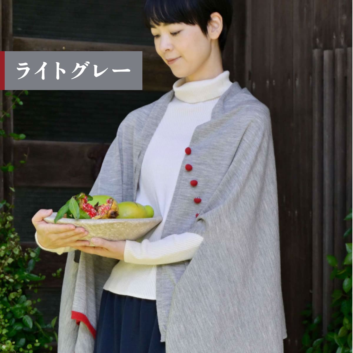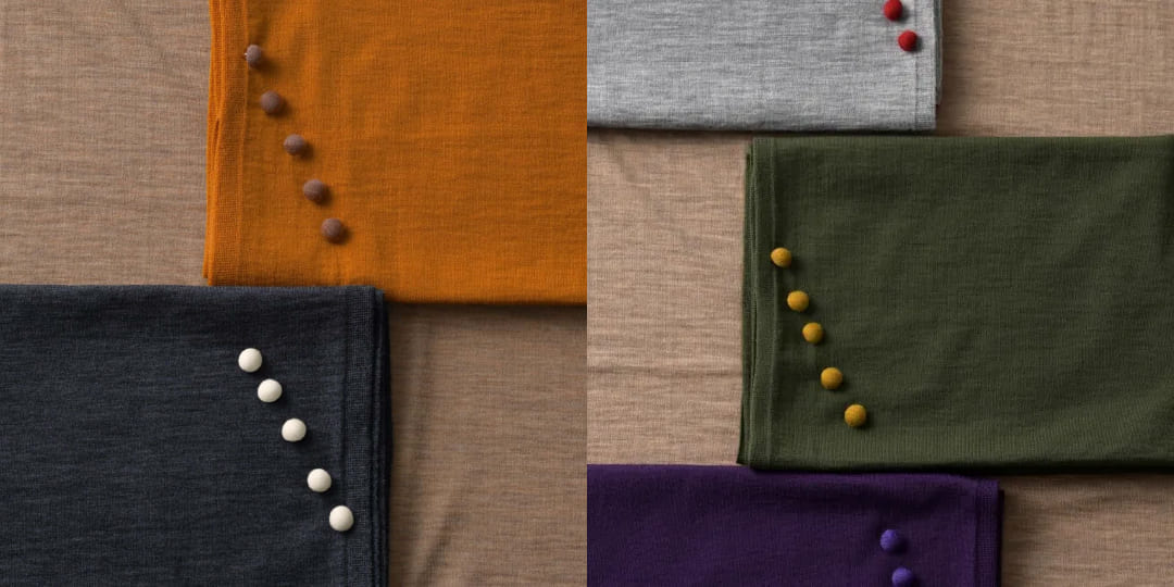 色とりどりの木の実をイメージした、ころんとかわいい「くるみボタン」付きのmino。前をしっかり留められるので、両手が使えてとっても便利です。