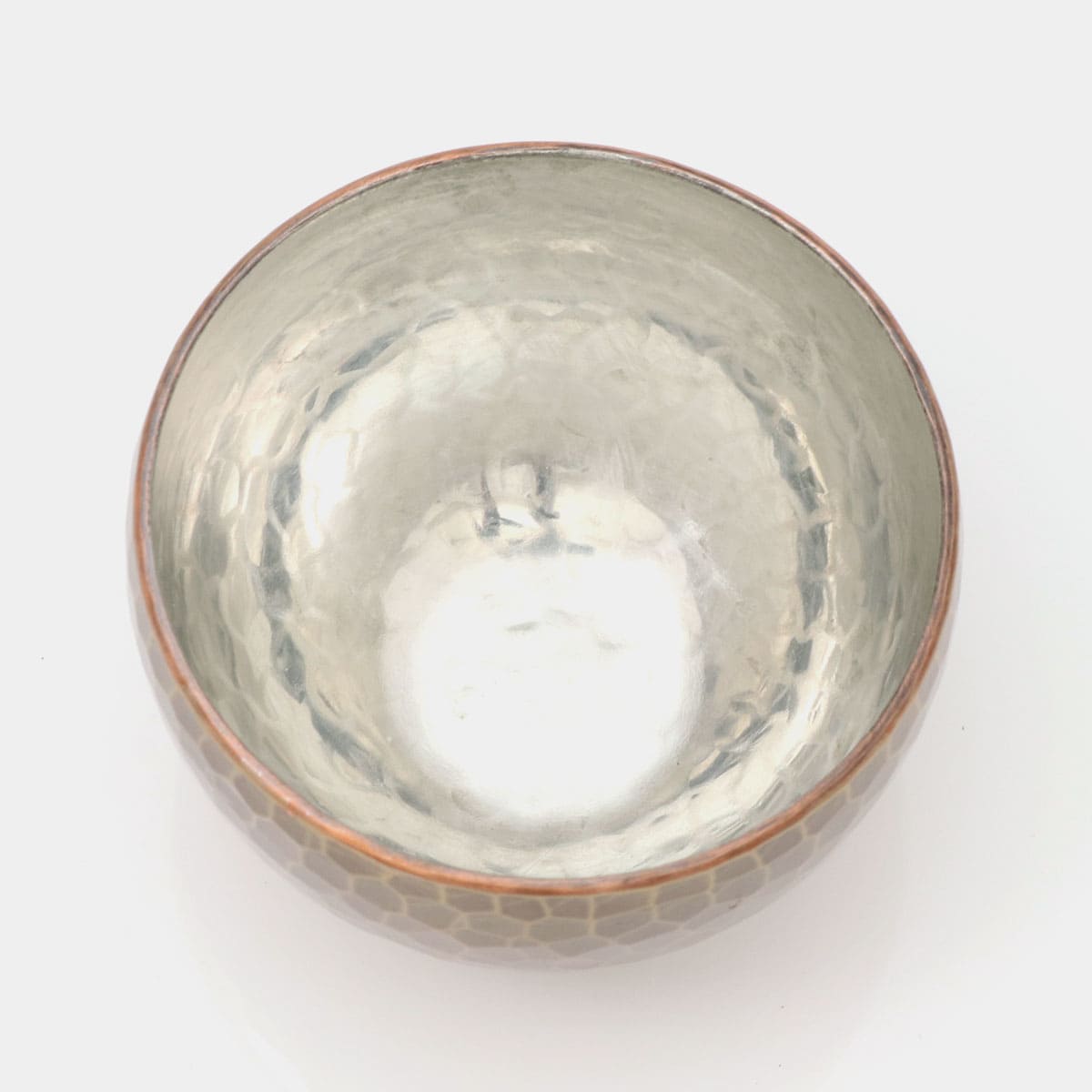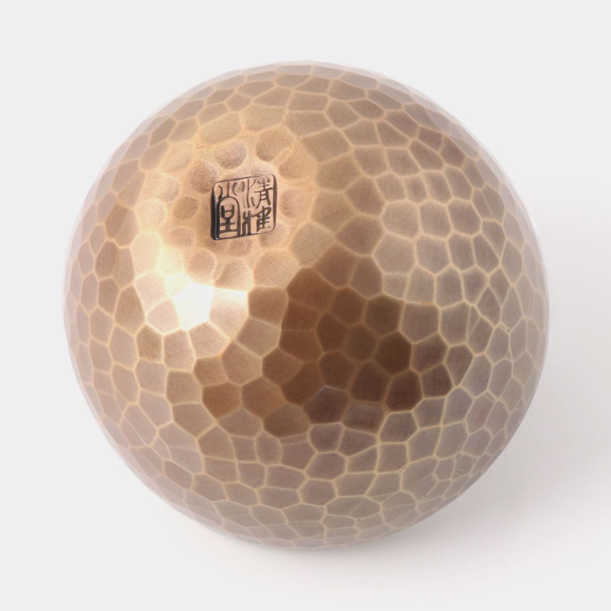 銅と聞いてイメージする色味と、鎚起と聞いて打ち起こされたイメージに近い形の器かと思います。酸化させた後に磨き上げ、磨かれた鎚目は網の目のように光り、深い部分には影のように黒みが残ります。鎚起の美しさがより際立つ逸品です。他の銅器同様に、使い続けることで色味が変化していきます。銅器は半永久に使えるものです。記念のお御品として贈られてみてはいかがでしょうか。