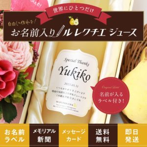 幻の洋梨ル レクチエジュースの名入れギフト。可愛いラベルにはお名前やメッセージ等お好きな内容を自由にお入れします。果汁100%のジュースは砂糖不使用なのに濃厚で甘く、果実そのままの味わい。77年前の生…