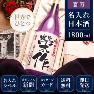 喜寿祝いプレゼント|生まれた日の新聞付き名入れ「紫龍」1800ml(日本酒)18,000円(税込)